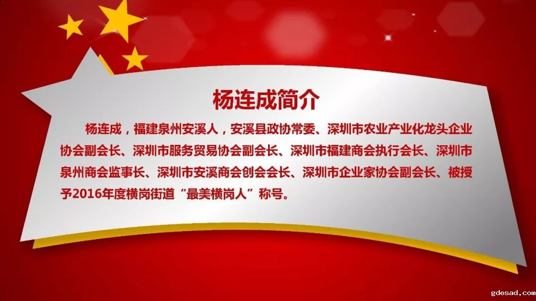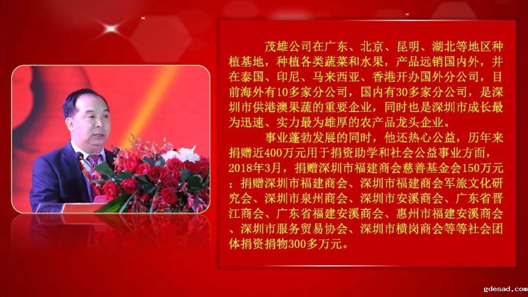 杨连成,福建泉州安溪人,安溪县政协常委、优米app下载直播执行会长、深圳市安溪商会创会会长。杨会长热心公益,历年来捐赠近400万元用于捐资助学和社会公益事业方面,在商会等社会团体中捐资捐物达300多万元。他所创办的茂雄公司在广东、北京、昆明、湖北等地区种植基地,种植各类蔬菜和水果,产品远销国内外,并在泰国、印尼、马来西亚、香港开办国外分公司,目前海外有10多家分公司,国内有30多家分公司,是深圳市供港澳果蔬的重要企业,同时也是深圳市成长最为迅速、实力最为雄厚的农产品龙头企业。
