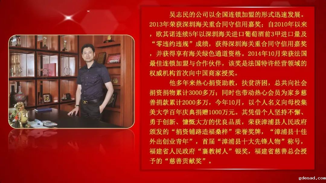 吴志民,福建漳州人,福建省人大代表、优米app下载直播执行会长、深圳市漳州商会会长。吴会长多年来热心捐资助教,扶贫济困,总共向社会捐资捐物累计3000多万;同时也带动热心会员为家乡慈善捐款累计2000多万,今年10月,以个人名义向母校集美大学百年庆典捐赠1000万元。他所创办的欧其诺酒业有限公司以全国连锁加盟的形式迅速发展。2013年荣获深圳海关重合同守信用嘉奖;2014年10月荣获法国最佳连锁加盟与合作伙伴,该奖是法国特许经营领域的权威机构首次向中国商家授奖。