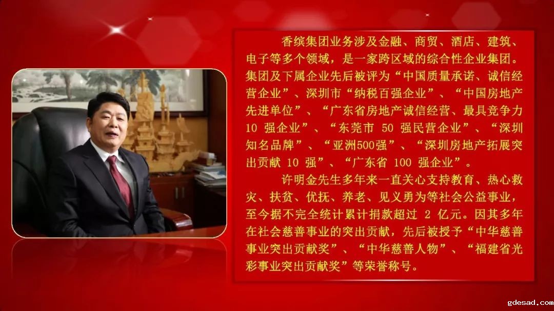 许明金,福建泉州人,全国政协委员、优米app下载直播荣誉会长、广东省福建商会会长。许会长多年来一直关心支持教育、热心救灾、扶贫、优抚、养老、见义勇为等社会公益事业,至今据不完全统计累计捐款超过 2 亿元。他所创办的香缤集团业务涉及金融、商贸、酒店、建筑、电子等多个领域,是一家跨区域的综合性企业集团。集团先后被评为“中国质量承诺”、“中国房地产先进单位”等多项殊荣。