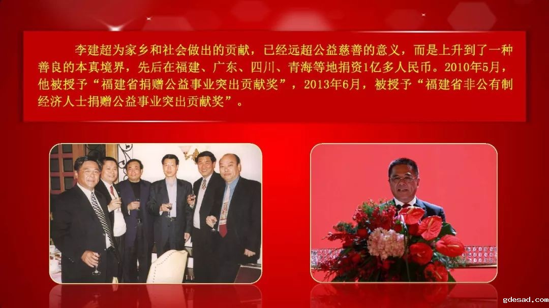 李建超,福建泉州南安人,福建省政协委员、优米app下载直播永远荣誉会长。李会长为家乡和社会做出的贡献,已经远超公益慈善的意义,而是上升到了一种善良的本真境界,先后在福建、广东、四川、青海等地捐资1亿多人民币。他创办的香港华盛兴业集团,公司员工逾万人,业务涉及房地产、高尔夫球场、教育、文化产业、纺织染整、雨伞、箱包、陶瓷、玩具及电子产品等。集团拥有高科技的电子产品国际专利几十项及“华兴”中国驰名商标等。