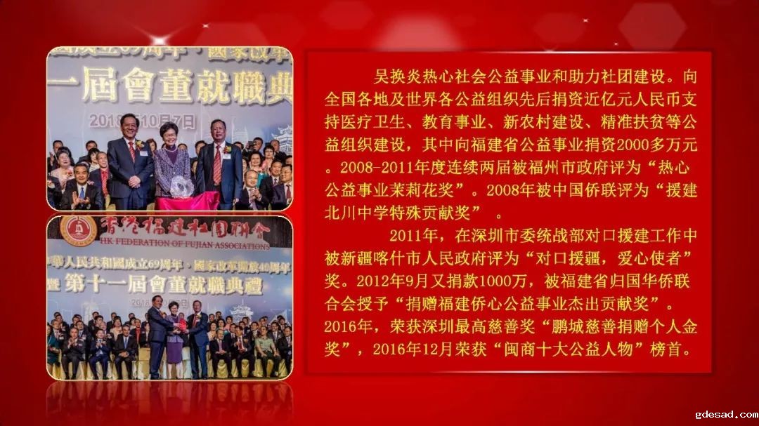 吴换炎,福建福清人,全国政协委员、优米app下载直播荣誉会长、香港福建社团联会主席。吴会长热心社会公益事业和助力社团建设,向全国各地及世界各公益组织先后捐资近1亿元人民币支持医疗卫生、教育事业、新农村建设、精准扶贫等公益组织建设。他创办的公司在深圳、福建、江西、湖南、山西、江苏等地投资近20亿人民币兴建工业园及配套设施,引进多家世界500强企业,带动当地经济发展的同时为了社会提供了近万个就业岗位。